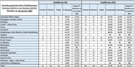 Directeurs d'Hôpital (DH) : Sur 2 440 DH en établissement, 1 265 (51,8 %) sont des femmes et 1175 (48,2 %) sont des hommes. La part des femmes était de 40,4 % au 1er janvier 2013, soit + 11,4 points sur la période. Parmi les 335 chefs d’établissement en poste au 1er janvier 2023, 90 sont des femmes soit 26,8 %.